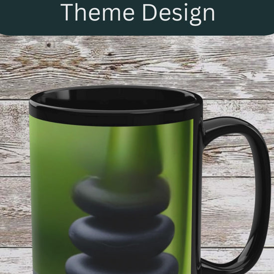 A deep, glossy black ceramic mug etched with a simple Bamboo Zen motif and three quiet words: Reflection • Gratitude • Growth. Warmth gathers in the 15oz curve as morning light spills across the bamboo silhouette. Hold the C-shaped handle and let a slow sip become a moment — a pause before the day, a breath between tasks, a tiny ritual to return to what matters. This mug fits onto a cluttered desk, beside a well-loved journal, or tucked into an evening of low light and soft music. It speaks to those who collect calm: people who practice mindful mornings, keep track of small wins, and appreciate objects that encourage intention without shouting for attention. Bring it out for reflective mornings, gratitude journaling sessions, quiet housewarmings, or simple at-home rituals that mark personal growth.