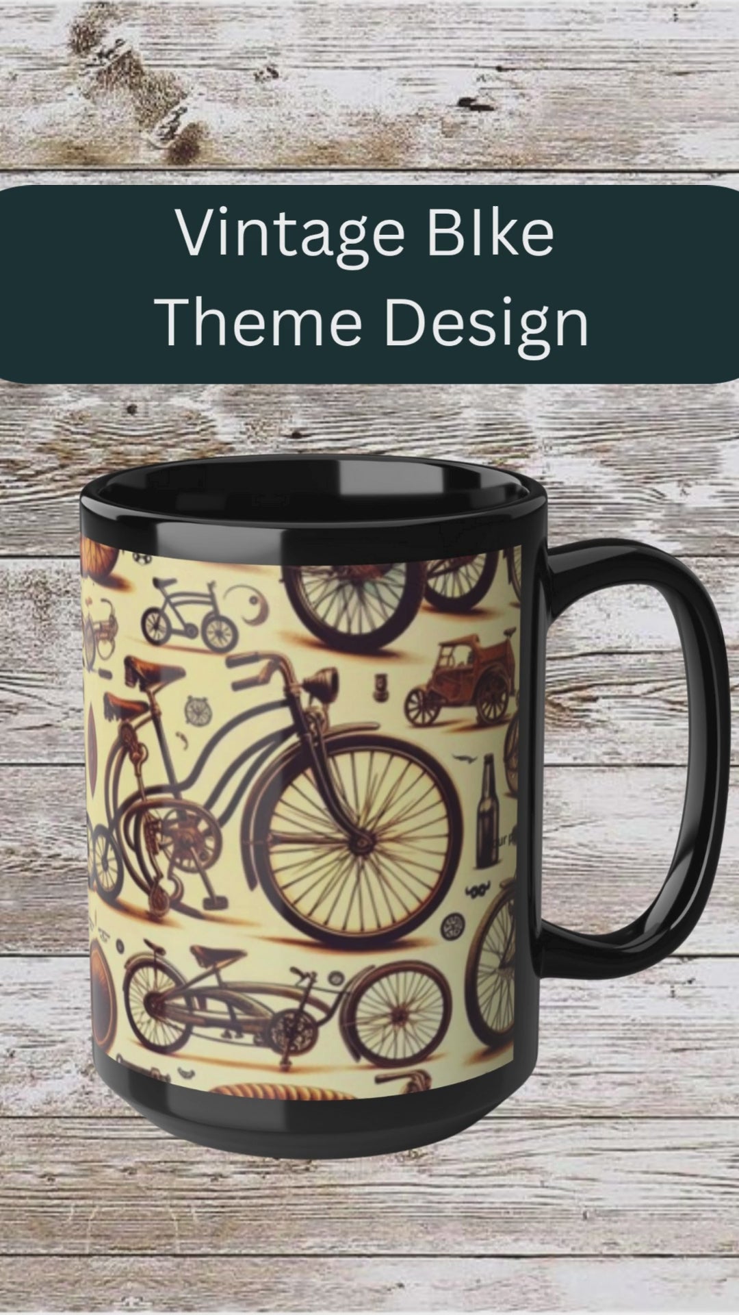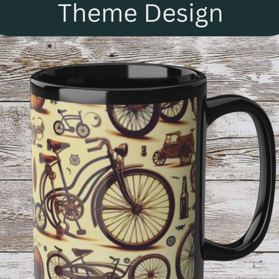 Vintage Biking Theme Black Mug - Perfect for coffee or tea lovers, this 15oz ceramic mug with a glossy finish is a unique holiday gift. Suitable for adults and compliant with US FDA standards, it features a C-shaped easy-grip handle.